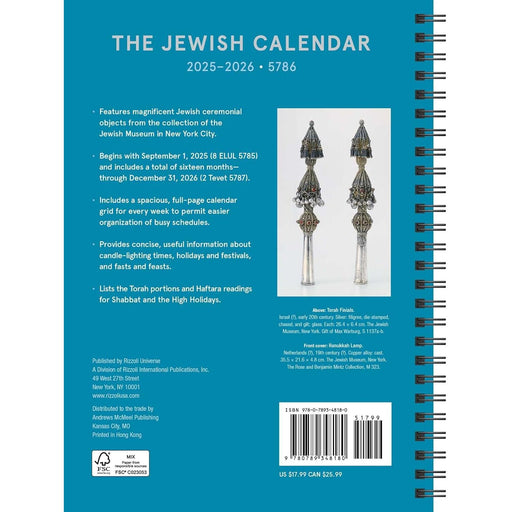 View full detailsThe Jewish Calendar 2025–2026 (5786) 16-Month Planner features 33 full-color Judaic ceremonial masterpieces from the internationally renowned colle...