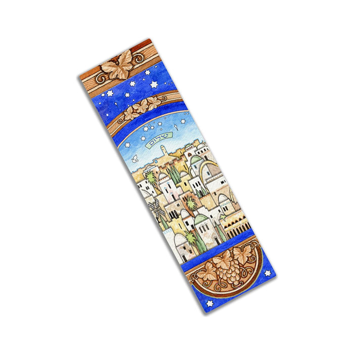 Mickie Caspi's Beautiful Antique Jerusalem Car Mezuzah is richly colored with fine details that shine through the acrylic of the car mezuzah. Double stick tape on the back allows easy attachment inside the car, or just place in glove compartment for peace of mind. The Travelers Prayer in Hebrew is rolled and placed inside the Antique Jerusalem Car Mezuzah and the translation is supplied on the enclosed card.
