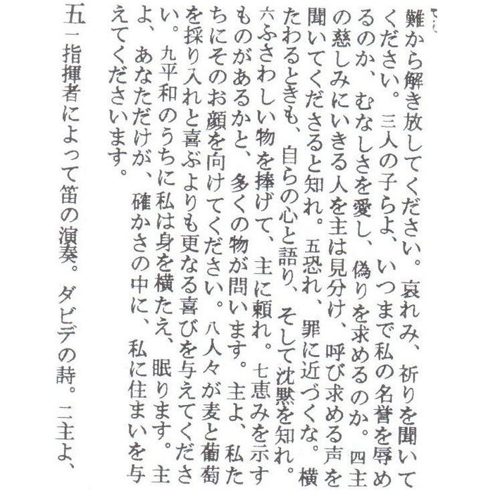 Pocket Book of Psalms in Hebrew with a complete and fine translation to Japanese. The Hebrew text comes in the right side and the Japanese text comes in the left side.\
