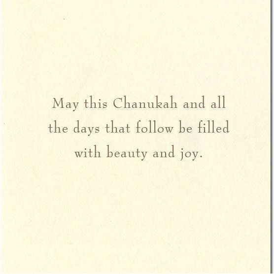 Folded ivory card (fold at left) featuring artwork by Michoel Muchnik depicting a beautiful dreidel. Sold in sets of 10 cards and blank envelopes.