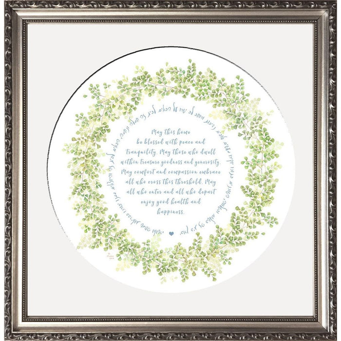 The Home Blessing Garland Framed Art Print by Mickie Caspi is a beautiful addition to any home. It is a wonderful gift -or- stunning artwork for your own home. In this art print, Mickie has created a modern home blessing filled with ferns and delicate flowers. It comes matted, framed and ready to hang.