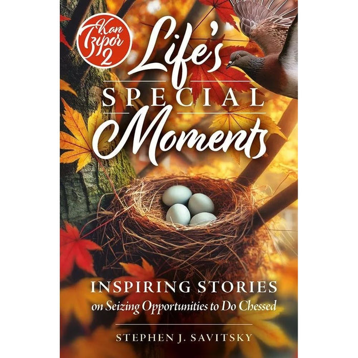 Believe it or not, Hashem might present you with your greatest opportunities to do acts of chessed when you are least prepared. Will you be ready to seize Life's Special Moments before they are lost forever? This book is a collection of true, riveting short stories about how people from all walks of life, at different times and in different locations, reacted to such “magic moments” of opportunity to do chessed in the most unexpected places — in a large Palestinian neighborhood south of the outer walls of Jerusalem’s Old City, in a German prisoner-of-war camp, at a wedding, on the banks of a Polish river, on a snowbound highway, and in many other venues. This life-changing book makes us ask, in every situation: “Why did Hashem put me in this very place at this very time? What chessed does Hashem expect me to do at this exact moment?” These stories train us to become what the author calls an “Observant Jew,” constantly on the alert for magic moments of opportunity to do chessed. We learn this concept from the mitzvah regarding a bird’s nest (kan tzipor), popularly known as shilu’ach ha-kan. The mitzvah of shooing away the mother bird before taking her eggs or nestlings cannot be orchestrated but happens “Ki yikarei kan tzipor lefanecha ba-derech” (Devarim 22:6) — unexpectedly, when we go about our normal daily activities — and it earns us blessings and long life. This second collection of such stories has been eagerly awaited by those who read his first book and will delight new readers as well. So treat yourself to a great read, be inspired to seize your own kan tzipor moments, and you too will look forward to incredible blessings. And if you missed Mr. Savitsky’s first book of “seize the moment” tales, titled Kan Tzipor, read that one, too! The acts of chessed that ensue might spark a national movement of good deeds in whose merit our nation will finally be redeemed. “Kan Tzipor quickly became a family favorite of ours, as its inspiring and very relatable stories sensitize us to the constant stream of opportunities that we are all given to seize a moment and make a lasting difference. The contagious love of life and drive for kiddush HaShem that are characteristic of Steve Savitsky jump off every page.” Rabbi Moshe Hauer, Executive Vice President The Orthodox Union