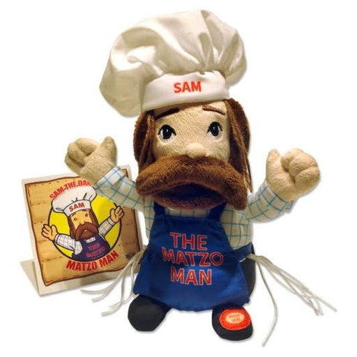 Matzo, Matzo Man, I want to be with the Matzo Man! Who wouldn’t want to celebrate Passover with this adorable leaven-free soloist who dances and sings to the tune of “I’m Sam the Dancing Matzo Man”? As adorable as this Matzo Man is with his hands raised high in celebration, this cute plush toy is the perfect gift for Passover. Although Sam the Matzo Man is light in weight and small in stature, his ability to delight children is irresistible. Matzo Man has a bushy mustache, and his long-hanging payos indicate he’s a real hemishe mensch. All this little guy needs is AA batteries (three to be exact) to provide hours of enjoyment. Sam’s ClothingSam the Matzo Man comes with a bright blue apron. He wears the hat of a professional chef with his name displayed on it in red letters, and his shoes are black. Chasidic looking man who sings and dances to an original child-friendly rap song.