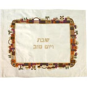 The cover is made of cream-colored raw silk and is then embroidered with beautiful multicolored thread. This challah cover is framed with a beautiful scene of Jerusalem buildings, archways, palm trees, and windmills. In the middle is written "Shabbat v'Yom Tov" in Hebrew, celebrating the Shabbat or any of the Yom Tov's it's used on.