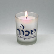 Remember the passing of your loved ones with this unique elegant Yizkor candle. This candle is presented in an elegant frosted glass cup with the world "Yizkor" written in navy in Hebrew