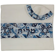 The tallit is embroidered with a Magen David pattern on a geometric crystal background in shades of blue.