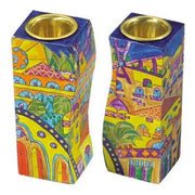 View of Jerusaelem Hand Painted Wooden Fitted Shabbat Candlesticks by Yair Emanuel