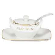 Saltwater dishe with serving spoon and tray made of fine ceramics, design with gold rim