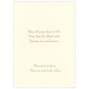 Folded ivory card (fold at left) featuring an swirled pomegranate from the artist Ilana Landau. Front of the card is only as shown. Inside is your sentiment and signature lines are printed. Use the sentiment as shown or choose a standard sentiment for free. You can also specify a custom sentiment for an additional fee. Hebrew "L'Shana Tova" can be added above your English sentiment for free as well, if desired. Cards are printed on recycled paper.