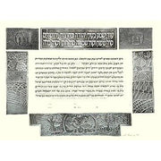 The illustrations surrounding the text of this Ketubah are exclusively embossed metal. Depictions of vineyard grapes, fruits of the sea, the lion of Judah, lovely peacocks and other symbols of fertility, life, love and wealth of the land are supplemented by the poetry of the Book of Jeremiah
