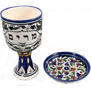 Armenian Ceramic Miriam Kos Kiddush Cup & Saucer in Floral Design Made in Israel