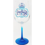 Cup of Elijah Whimsical Graphic Design Fused onto Blue Stem Wine Glass *3.5 " W x 9 "H *16 oz As Each Piece Is Hand Made And Unique, No Two Will Be Exactly Alike.