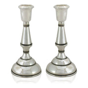 Sterling silver candlesticks which transform a classic design. Graceful silver lines, rich filigree and a rounded, tiered base create the unique look while keeping with the traditional design. Watch the light of the Shabbat candles glisten through the cut-out designs and onto the smooth silver.