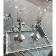 Beautifully spread the light of Shabbat and the holidays with this gorgeous set of Shabbat candlesticks from Jerusalem Glass Studio. Handcrafted from glass, each candlestick is colored black and is exquisitely decorated with sterling silver along both the top and bottom. Available with a matching tray, this set of candlesticks is the perfect way to connect your Shabbat and holiday celebrations to the Land of Israel.