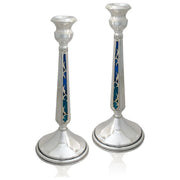 Sterling silver candlesticks which transform a classic design. An elegant paneled silver body, tiered base, flared top and elegant touches of filigree redefine the candlesticks while honoring the traditional design. The candlesticks are complete with colorful enamel peeking through the front panel, decorated with delicate silver leaves. Watch the light of the Shabbat candles glisten in the smooth silver and enhance your Shabbat experience.