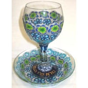 Blue Flowers Painted Glass Kiddush Cup with Saucer Hand Made in Israel By Nurit Naor