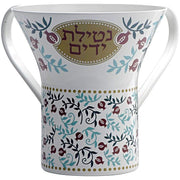 • A Washing Cup, for the mitzvah of washing hands before eating bread. The tool made of Aluminum, with a beautiful pomegranates print and the words "washing hands"It does not rust, lightweight and pleasant to use. The Washing Cup will decorate every corner of washing hands in the kitchen or bathrooms.Can match a Hand towel with the same design.
