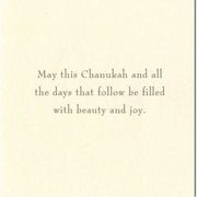 Folded ivory card (fold at left) featuring artwork by Michoel Muchnik depicting a beautiful dreidel. Sold in sets of 10 cards and blank envelopes.