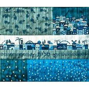 The quilted design on the bag depicts a stylized Jerusalem cityscape in sparkling Mediterranean Sea blues, with the Hebrew word "tallit" in the center.