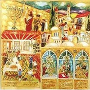 "Channukah, the festival of lights, is depicted in this richly-colored tableau by artist Michal Meron