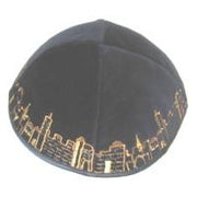 Fancy Navy Blue high quality velvet kippah with embroidered images of Jerusalem