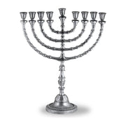 Large traditional Chanukah Menorah uses Candles or oil. This Menorah has been designed and sized with the specific intension of fitting Shabbat candles or prefilled oil cups, both options will fit well without the need of any extra support of rubbers etc. A very authentic traditional design with a wide base. Exceptional presentational piece Screw off base stem for easy storage Uses candles or oil, select below 20.5' H x 16.5' W x 7' D