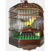 "Singing bird in a faux bamboo cage.