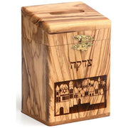 Finely handcrafted in Israel from solid olive wood with a laser cut of Jerusalem and the Hebrew word "Tzedakah" on the front. Makes a beautiful Bar Mitzvah gift! Hinged top with clasp